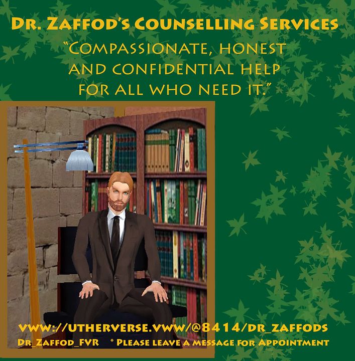 To book a counselling session with Dr. Zaffod. Please leave a message on this profile. Please provide window of time for you to meet in Pacific Time Zone. First 30 minute session is FREE. Follow up 50 minute sessions are 60-80 rays/session. I play fast and loose with what I charge if at all. However, if you just spent 200 rays on clothes the other day...consider the value of my time and assistance when you come to me. I am here to help YOU.